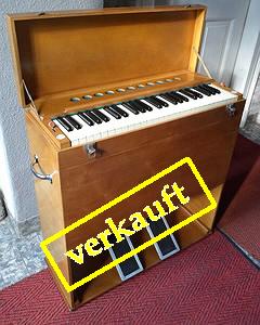 Was man alles so bauen kann! Mit zwei Spielen kommt dieses Kleinstharmonium daher, ein 8' auf 442,5 Hz und einer auf 440 Hz, die zusammen als Schwebung eine wunderbare Klangfülle ergeben, dazu wie häufig beim Druckwind ein musikalisch fragwürdiges Tremolo und eine nicht sehr wirkungsvolle Forteklappe.