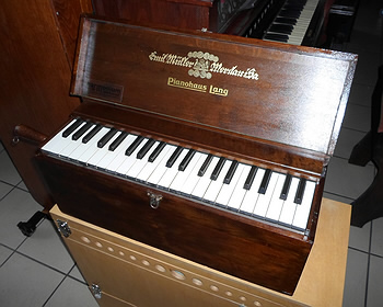 Bei den Arbeiten an diesem Instrument würde ich nicht von einer vollständigen Restaurierung sprechen. Wollte man tatsächlich die filigranen Bälge und die noch filigranere Spielmechanik (sowohl in Bezug auf die Klaviatur als auch die Tonventile) in den Originalzustand versetzen, wäre die Überholung knapp fünfstellig zu kalkulieren. Auch so ich habe es wieder vollständig bespielbar gemacht (Luftversorgung, Mechanik- und Zungenreinigung) und den raffinierten Korpus überholt, dabei alles original belassen ist das Instrument eines für jemanden, der aus kulturhistorischen Interesse so etwas Wertvolles sammelt und den hineingesteckten Aufwand zu honorieren bereit ist. Wie gesagt: man kann darauf wunderbar musizieren! |