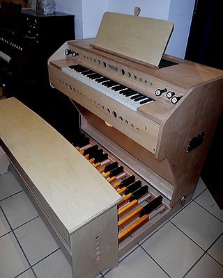 | Die Entstehungsgeschichte dieses neu gebauten Pedalharmoniums lesen Sie unter dem Hauptmenüpunkt "Unser täglich Brot. Instrumente in Arbeit". Es wurde entwickelt, um ein Instrument mit 27-Töne-Vollpedal anzubieten, das für vielseitige Zwecke dienen kann: