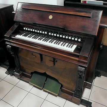 Beginnen wir den Reigen der erwerbbaren Druckwindinstrumente gleich mit einem besonderen Exemplar: Dieses Harmonium ist zwar "nur" ein klassisches Vierspiel, erweitert um einen zweiten 16’ im Diskant (Musette) und einige vorwählbare Klangkombinationen (Violoncelle, Saxophone, Celeste, Cornemuse), hat jedoch bereits die besonderen Einrichtungen eines Kunstharmoniums.