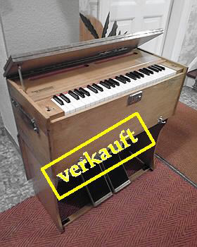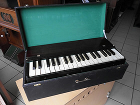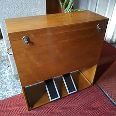Auch hier dasselbe Handling: spielfertig ist es in nur ca. 15 Sekunden einfach die Verriegelungen in den beiden seitlichen Griffschalen ziehen und den Koffer anheben. Dann bleibt die Bodenplatte mit den Tretschemeln stehen und der Rest rastet in Spielhöhe automatisch ein. Getrennt zu betätigende Schwellklappen für Baß uind Diskant fügen dem warmen Grundklang ein schönes Obertonspektrum hinzu. Ein tolles Schätzchen zum Musikmachen unterwegs... |