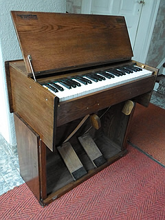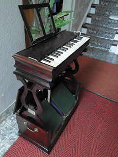 Was man alles so bauen kann! Mit zwei Spielen kommt dieses Kleinstharmonium daher, ein 8' auf 442,5 Hz und einer auf 440 Hz, die zusammen als Schwebung eine wunderbare Klangfülle ergeben, dazu wie häufig beim Druckwind ein musikalisch fragwürdiges Tremolo und eine nicht sehr wirkungsvolle Forteklappe.