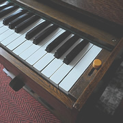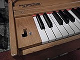 Es kommt aber auch mit einer kräftigen und ausdauernden Stimme daher, seit die Blasebälge neu bezogen und die Zungen nachgestimmt sind genauer gesagt: mit zwei Stimmen. Denn der kleine Hebel links neben den Tasten aktiviert einen 8', das Gegenstück rechts einen 4'. Der tragfähige Klang kommt vor allem daher, daß der Stimmstock hinten senkrecht steht und die als Ventile ausgebildeten Tastenschwänze direkt auf den Kanzellen aufliegen. Damit ist die Klangabstrahlung maximal direkt.