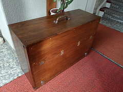 Natürlich wurden die Blasebälge neu bezogen, beide Zungenreihen für heutigen Gebrauch höhergestimmt und das etwas ramponierte Gehäuse geleimt, oberflächenbehandelt und mit neuen seitlichen Griffen und einem neuem Schloß versehen. Damit wartet es nun auf seinen mobilen Einsatz.