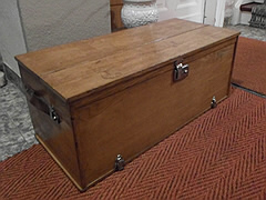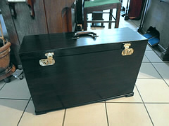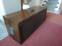 Zahlreiche Arbeitsstunden flossen nicht nur in die Überholung von Balg, Mechanik, Zungen und Tonventilen, sondern auch der fast ganz zerfallene Transportkoffer mußte gerichtet, neu bezogen und innen ausgefüttert werden.