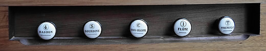 Das erste 8`-Register, die [1] Flûte, besitzt eine Abschwächung ([S] Sourdine) und geht über die gesamte Klaviatur, die hier von F bis f''' reicht, die zweite ist bei h/c' geteilt und bildet mit dem [4] Basson 8' eine schöne Verstärkung der Baßlinie und im Diskant eine schwebende [C] Voix celeste 8'. Der Vorabauszug der Celeste ist das [T] Tremolo, das im Zusammenspiel mit der Flûte sehr hübsch klingt, was man von einem Druckwind-Tremolo in den seltensten Fällen behaupten kann.