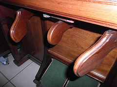 Bei den Kniehebeln ist das Volle Werk links in der Endstellung selbstarretierend und wird per Knie mit einem Knopf wieder ausgelöst. Der rechte Kniehebel kann nach Vorauswahl mit dem kleinen Hebel neben der Klaviatur wahlweise nur die Schwellklappen des Baß, nur die des Diskants oder beide Seiten stufenlos steuern. So viele schöne Klangmöglichkeiten!